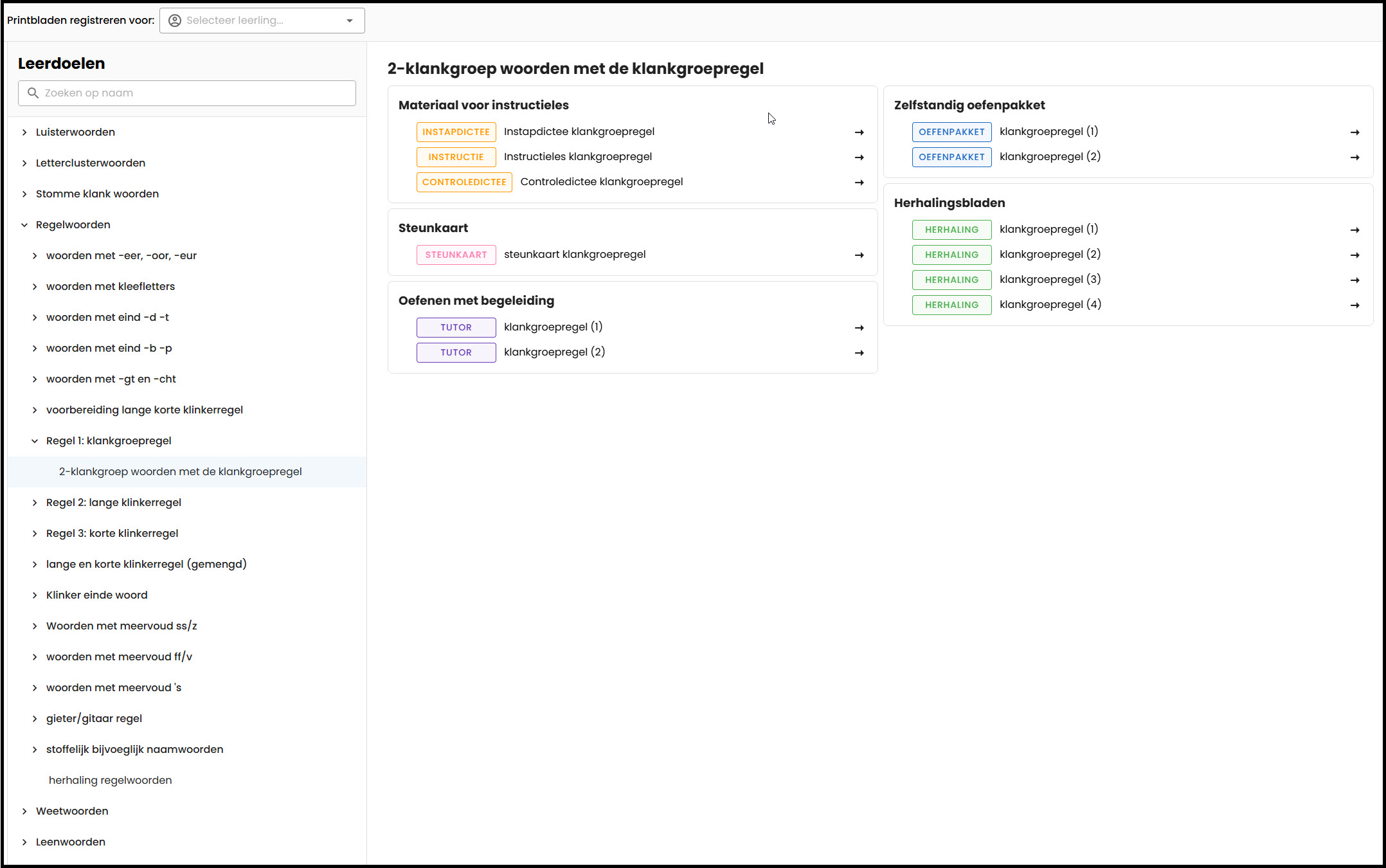 Het printgedeelte van het programma biedt een overzichtelijke interface om direct werkbladen af te drukken. Met de knop "Nieuw blad genereren" kun je snel een nieuwe versie van het oefenblad maken. Dit is bijzonder handig wanneer een leerling een leerdoel nog niet heeft behaald: je kunt dan eenvoudig een nieuw werkblad met andere woorden en oefeningen printen, zodat de leerling verder kan oefenen zonder herhaling van exact dezelfde opdrachten.