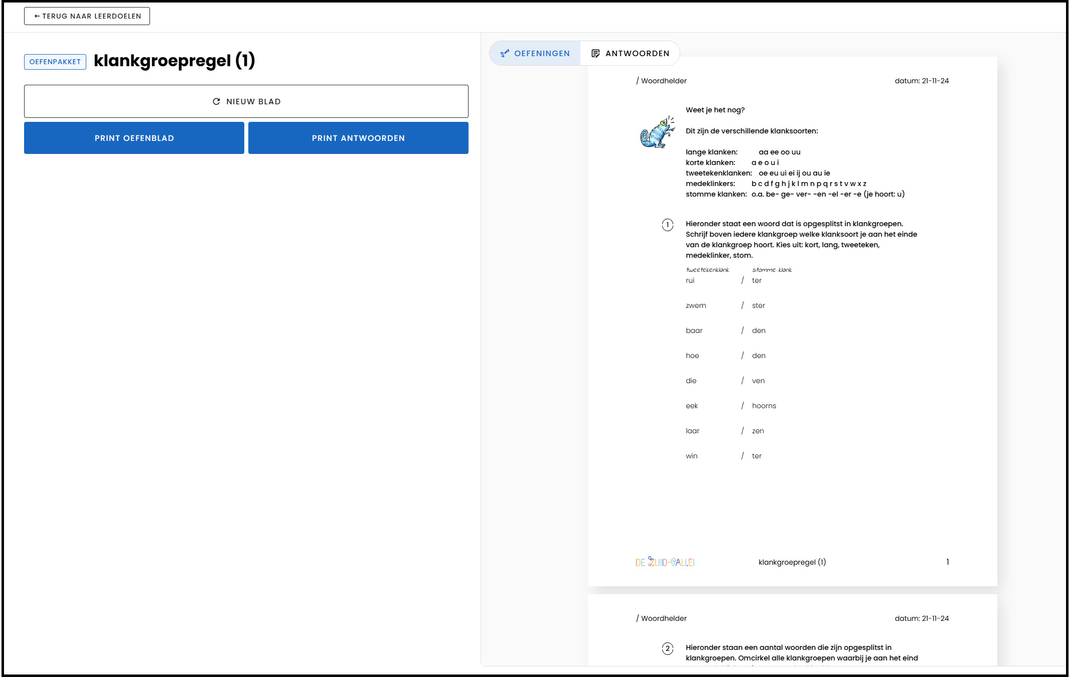Met Zuid-Vallei Printer kun je in een handomdraai spellingsoefeningen genereren, volledig afgestemd op specifieke leerdoelen. Binnen elk leerdoel kun je verder differentiëren met verschillende woordcategorieën of klankgroepen. Op dit moment is de module Spelling toegevoegd later volgt ook nog een module rekenen.